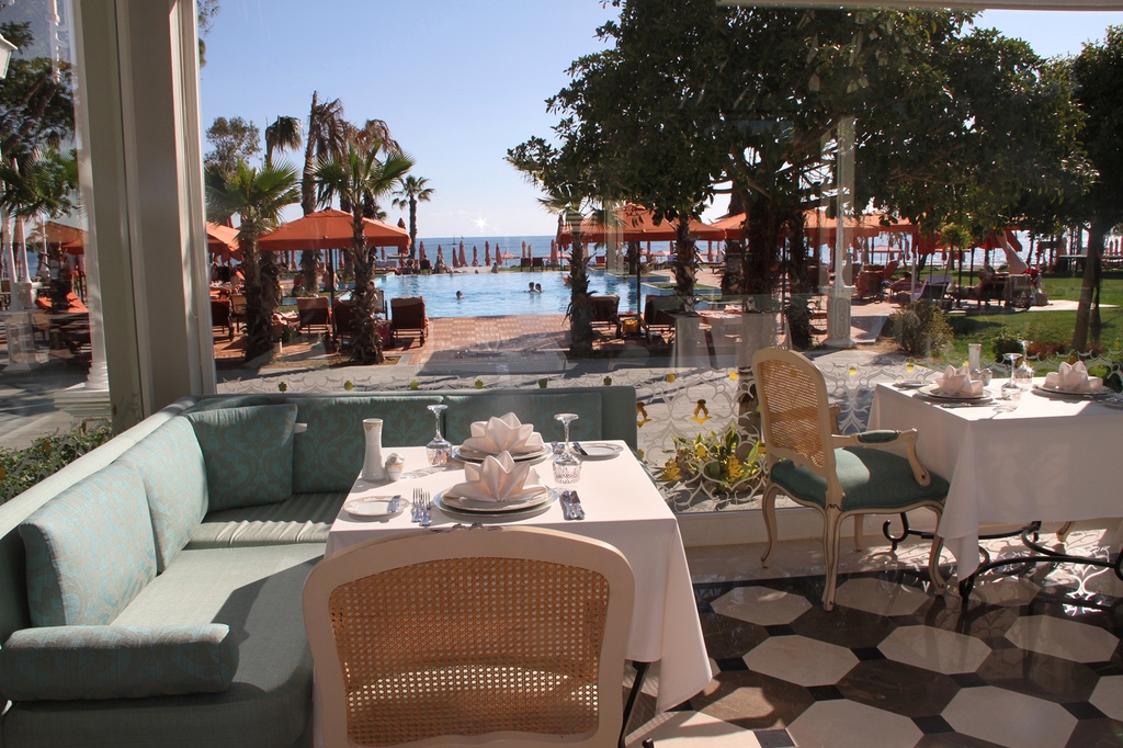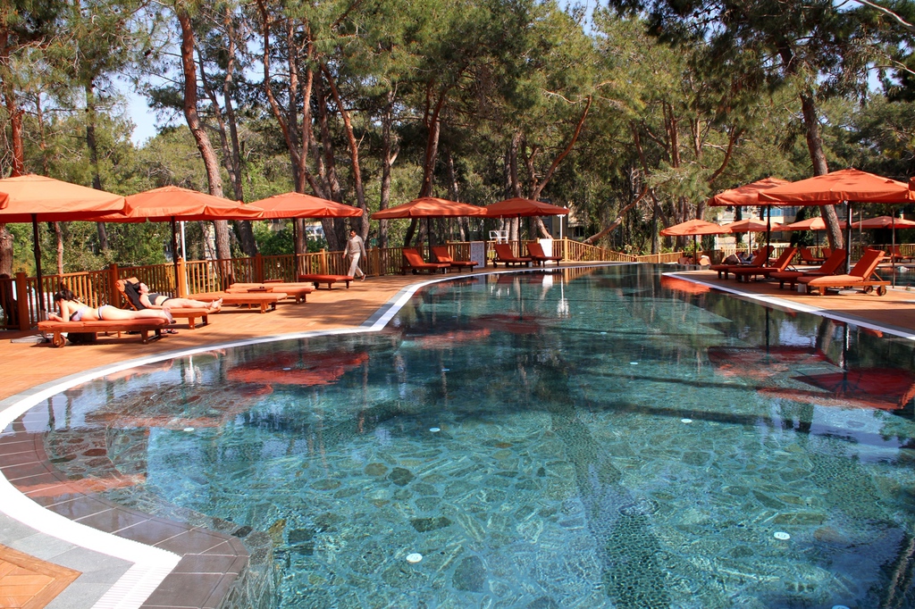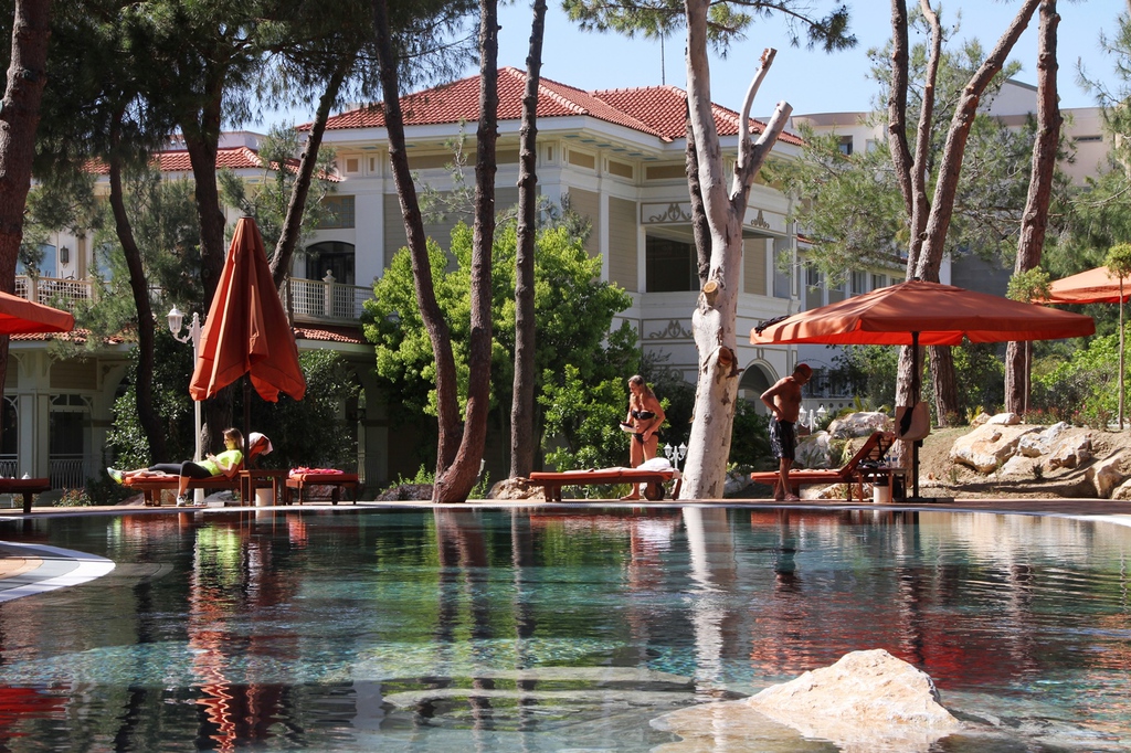 Das Ali Bey Resort Side liegt direkt am Meer, an einem langen, breiten Sandstrand inmitten eines alten Pinienwaldes. In die historische Altstadt von Side ist es nur wenige hundert Mete. Die luxuriöse Fünfsterne-Clubanlage mit 17 Gästehäusern wurde im modernen osmanischen Stil in einer herrlichen Gartenanlage erbaut. Außer dem großen Tenniscamp Europas finden Sie hier ein professionelles Fitness Studio der "Fitness First"-Kette, viele Wassersportmöglichkeiten, Yoga- und Gesundheitskurse - optimale Voraussetzungen für einen sportiven Urlaub. Im Zentrum des Resorts befinden sich das Restaurant, Cafés, eine Partisserie und die großen Süßwasserpools, die mit 27 Grad beheizt werden, falls das Meer ein wenig kühl sein sollte.